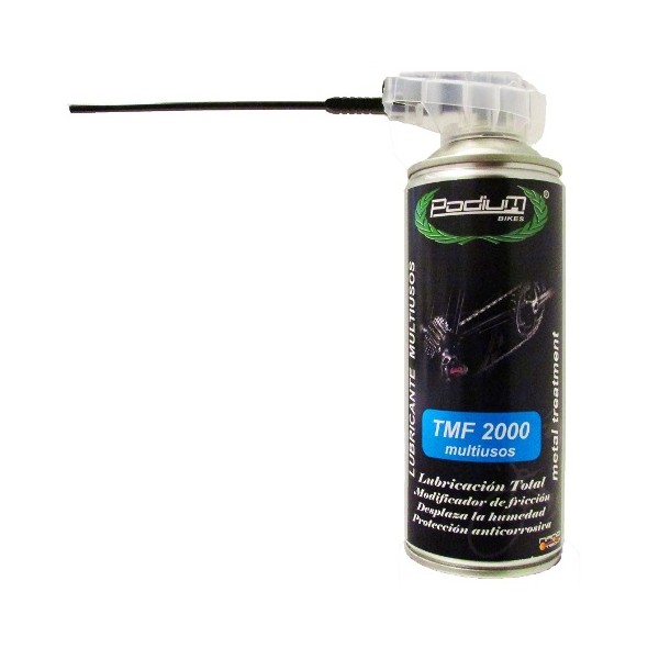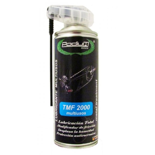 Spray lubricante multiusos TMF 2000 de la marca Podium. Diseñado para todo tipo de lubricación y engrase en bicicletas. Disminuye la fricción (elimina ruidos y chirridos). Disminuye el desgaste en piñones y platos. Protector anticorrosivo y ante la humedad y agua. Cantidad: 400ml