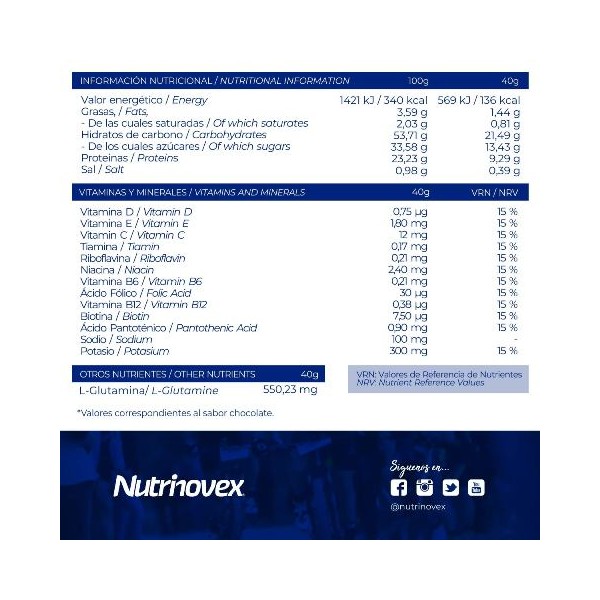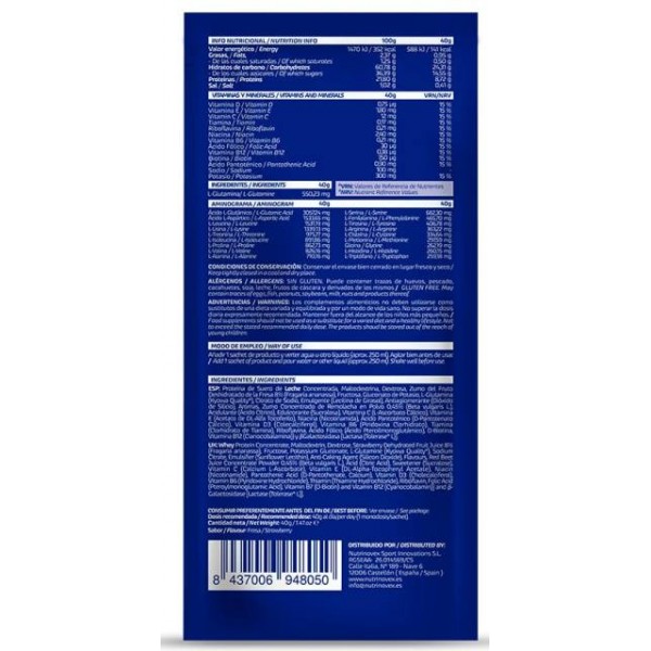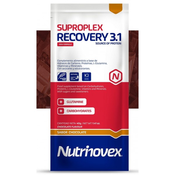 Monodosis Recovery 3.1 Nutrinovex en polvo contribuye a la recuperación muscular. Formulado con una combinación 70% Hidratos de carbono y un 30% de proteínas. Sabor: Chocolate o Fresa. Durante el entrenamiento o competición disolver 1 sobre (40gr) por cada 250ml de agua. Opciones: 1 Sobre (40gr) o 1 Caja (12 sobres).