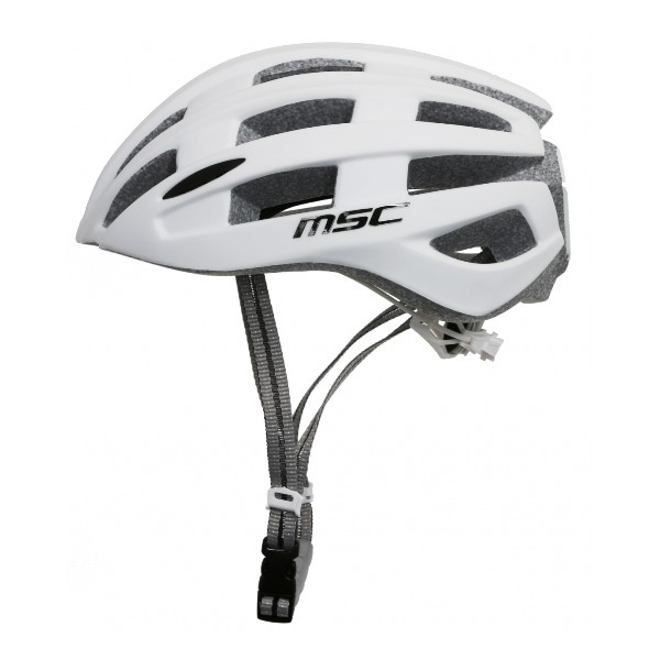 Casco para bicicleta de carretera con luz de la marca MSC. Luz de seguridad en la parte trasera del casco de 2 posiciones: encendido e intermitente. Dispone de 6 LEDs y funciona con una pila de botón. Color: Blanco. Rulina ajustable, almohadillas intercambiables y con almohadilla para la barbilla. Tallas disponibles S/M (55-58) y M/L (58-61).