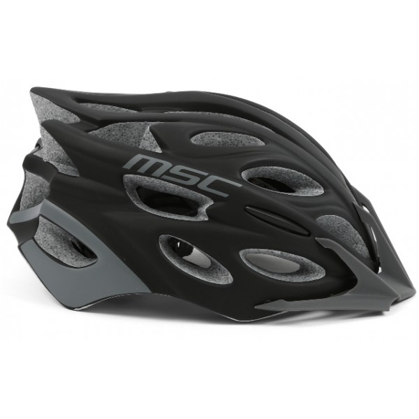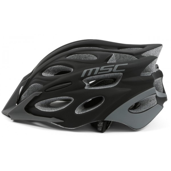 Casco para bicicleta de montaña de la marca MSC, modelo Inmold. Color: negro y gris. Rulina ajustable, visera extraíble y almohadillas intercambiables y lavables. Correa ajustable y con almohadilla en la barbilla. Tallas disponibles S/M (55-58) y M/L (59-62).