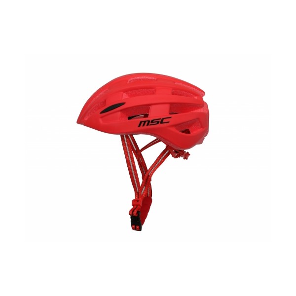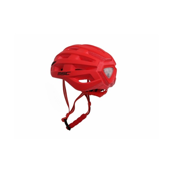 Casco para bicicleta de carretera con luz de la marca MSC. Luz de seguridad en la parte trasera del casco de 2 posiciones: encendido e intermitente. Dispone de 6 LEDs y funciona con una pila de botón. Color: Rojo. Rulina ajustable, almohadillas intercambiables y con almohadilla para la barbilla. Tallas disponibles S/M (55-58) y M/L (58-61).