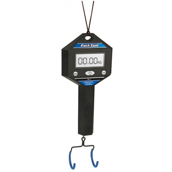 Báscula Digital DS-1 de la marca Park Tool. Diseñada para pesar bicicletas, cuadros y componentes. Se puede sujetar en un soporte de reparación o bien colgarla en algún gancho o brazo. Incluye un doble gancho recubierto de silicona.