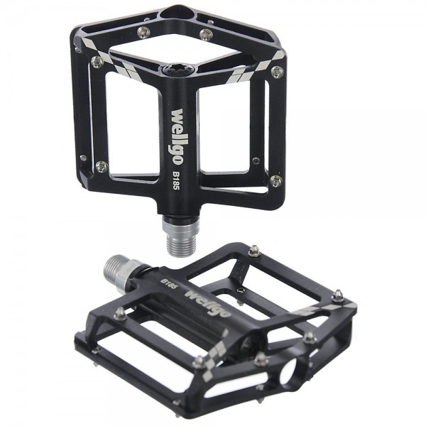 Pedales de plataforma de la marca Wellgo. Excelentes para bajar rápido gracias a su amplia superfice de apoyo.