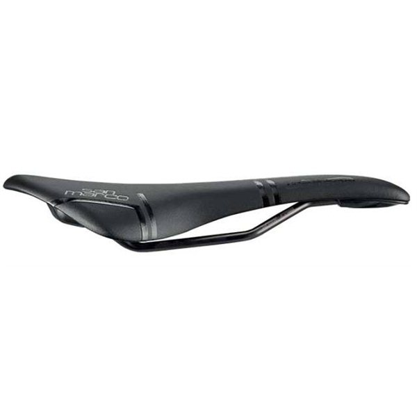 Sillín para bicicleta San Marco con estructura construida enteramente en fibra de carbono (carcasa y railes), la ligereza es su esencia. Ideal para ciclismo de carretera.